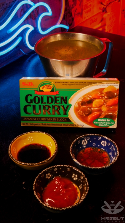 Curry and condiments separate, pre-dissolved, and stirred into the pot
